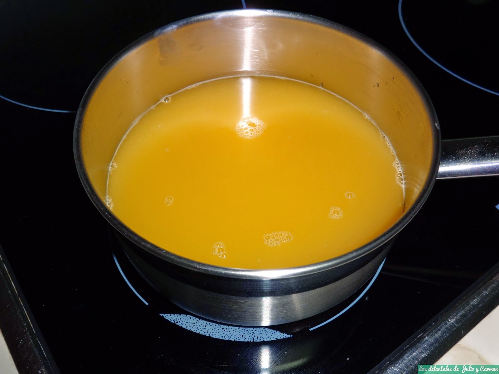 Lo primero, extraemos el zumo a las naranjas (unas 5 o 6). Lo pondremos en un cazo a fuego medio.