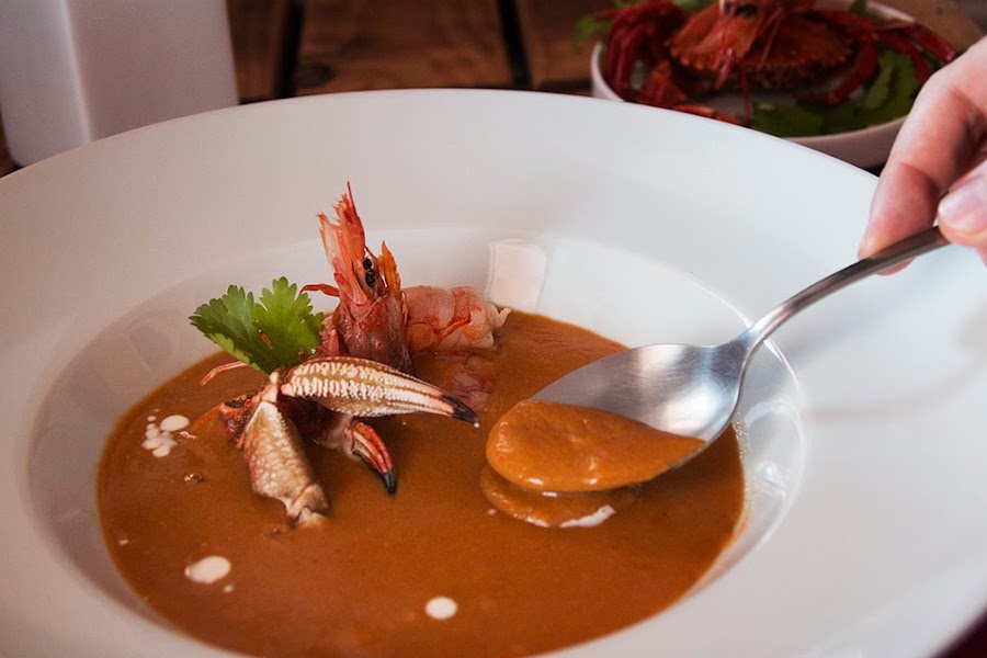 Apagamos y emplatamos. Colocando un par de pinzas por plato, una gamba y la cabeza de la misma pasada ligeramente por una sartén. Decoramos con unas gotas de nata (crema de leche) y una hoja verde de perejil, cilantro o eneldo. Servimos caliente.