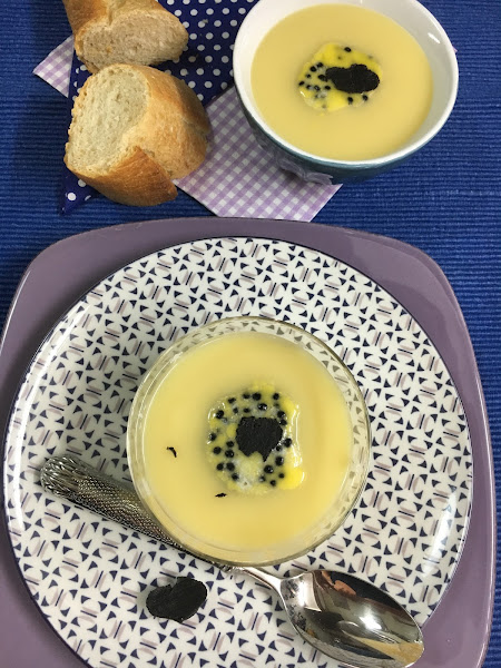 Como tengo residentes unos kilitos del verano estoy buscando aligerar los platos para que no carguen con tantas calorías. Diréis que la mantequilla de trufa es una bomba calórica, pero es una pequeña concesión al placer que, realmente, no aporta tanto pues se añade una pequeñísima cantidad en cada vasito.