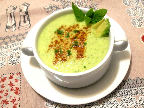 Llenar los boles con la crema fría, espolvorear un poco de pimentón picante, adornar con unos trozos de aguacate y unas hojas de menta.