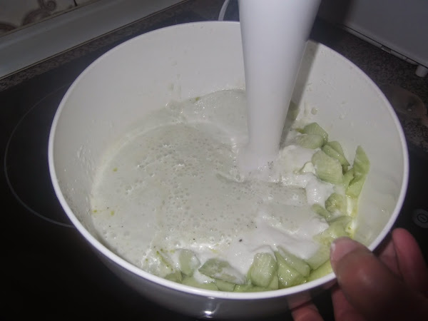 Pelamos los pepinos, los cortamos en cachos y lo echamos en el recipiente en el que vayamos a batir la mezcla. A continuación, añadimos los yogures, el aceite, el vinagre, la sal y la pimienta. Batimos todo hasta que se nos haya desecho el pepino y la metemos a la nevera hasta la hora de comer. Una vez que tenéis la crema batida probarla de sal para ver si está a vuestro gusto, es una crema muy ligera, aunque si queréis aumentar el sabor a pepino le podéis poner alguno más o colocar alguna trozo para decorar.