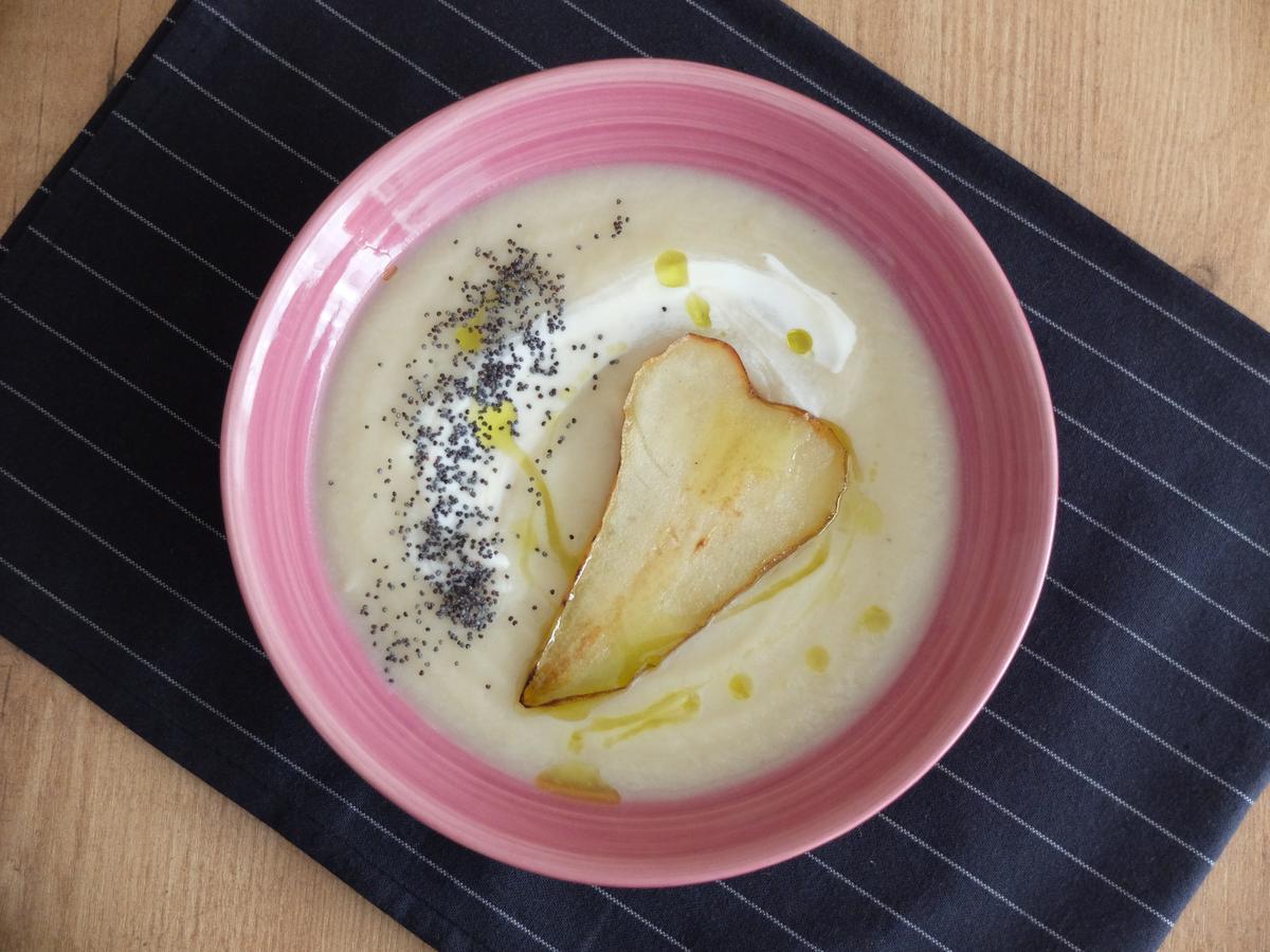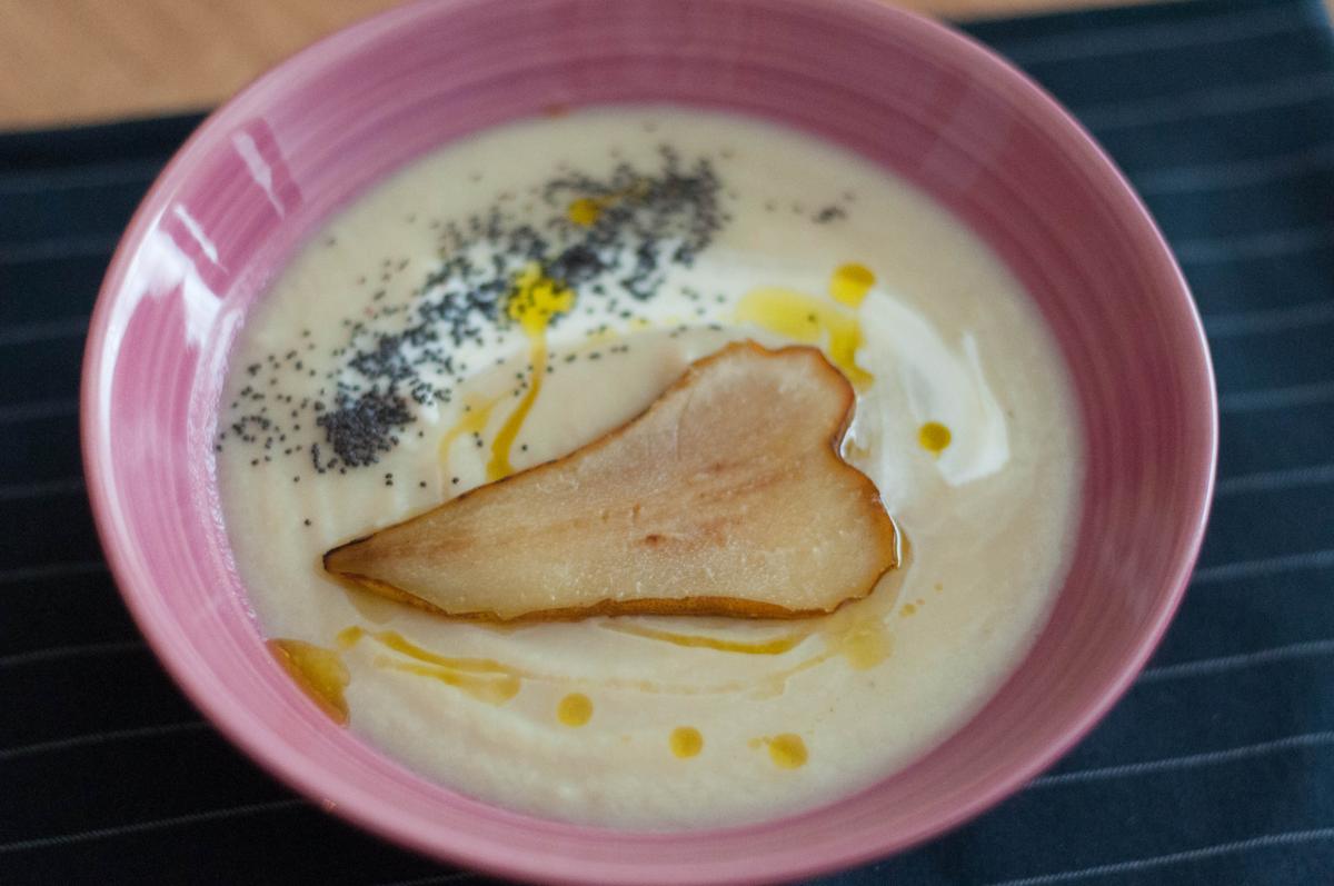 6.- Servimos la crema de pera y coliflor en raciones individuales. en cada cuenco pondremos una lámina de pera dorada, una cucharada de semillas de amapola y un chorrito de aceite de oliva.