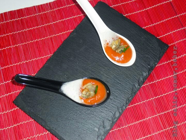 Si tienes cucharillas de presentación, puedes poner la crema de pimientos en el fondo, un poquito del aire de los berberechos que recogemos de la superficie del bol y finalizamos colocando uno o dos berberechos y un toque verde a vuestro gusto, en este caso hemos usado un poco de cebollino.