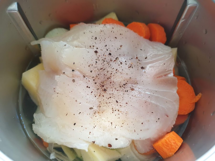 2. - Lo ponemos en una olla junto con el bacalao, y salpimentamos un poco.