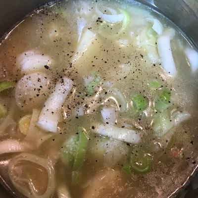 3. Luego, lo rehogamos y añadimos un vaso y medio de caldo de verduras o de ave, una pizca de sal y pimienta.