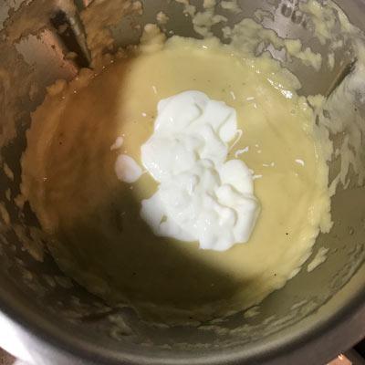 5. Después, pasamos al vaso de la batidora, añadimos medio vaso de leche evaporada o nata (crema de leche). Así te saldrá mas cremosa.