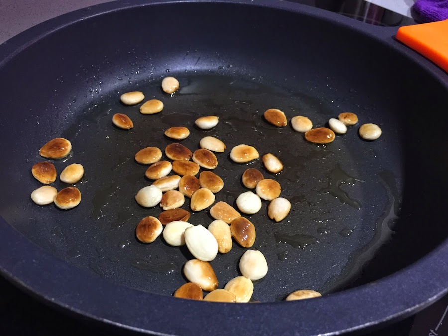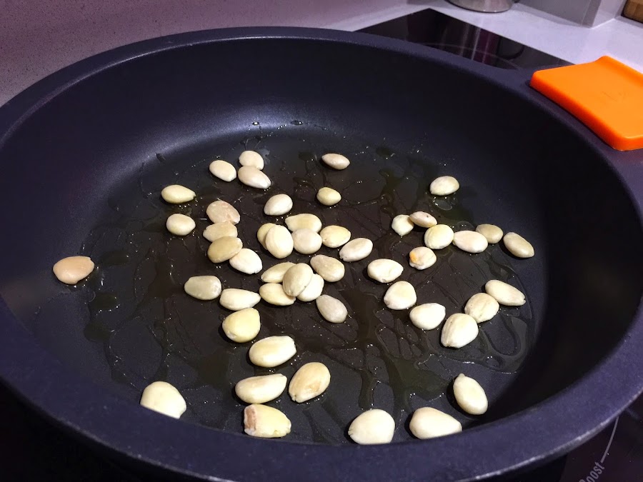 1. Ponemos un chorrito de aceite de oliva virgen extra en la cazuela y calentamos a fuego medio. Freímos las almendras hasta que tomen un color dorado. Una vez tostadas las reservamos.