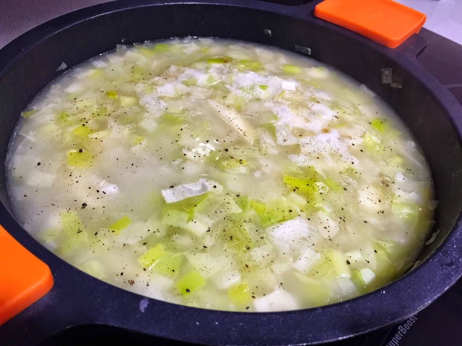 5. Añadimos agua, la justa hasta que cubra el puerro y las patatas. Salpimentamos y dejamos hervir a fuego medio durante 30 minutos.