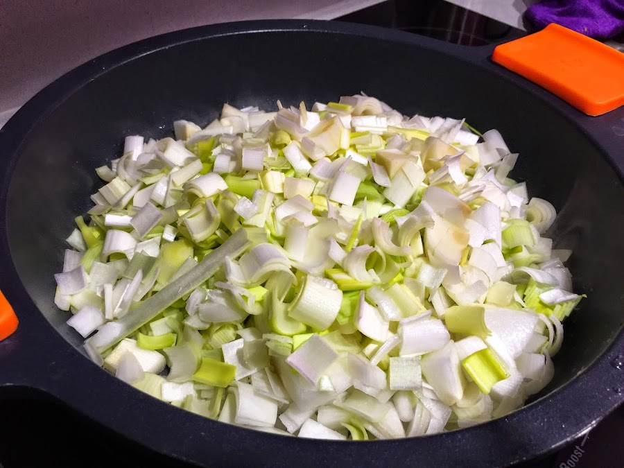 2. En el mismo aceite donde hemos tostado las almendras añadimos los tres puerros y la cebolla cortados a cuadraditos pequeños. Sofreímos a fuego medio durante 10 minutos.