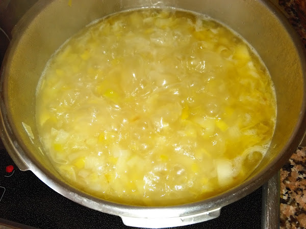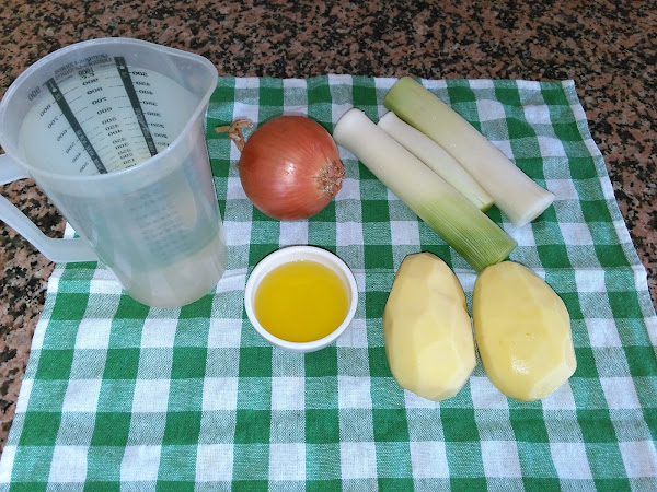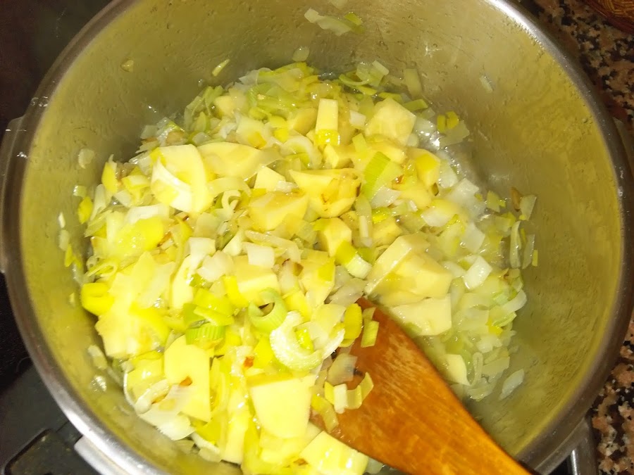 Bueno, esto es una receta muy simple, echamos el aceite en recipiente y echar la cebolla y el ajo puerro (todo troceado) a pochar, después de unos minutos echar las patatas también troceadas, rehogamos un poco todo, echamos la sal y el agua, tapamos y dejamos cocer durante 30 minutos (contados desde que empieza a hervir)