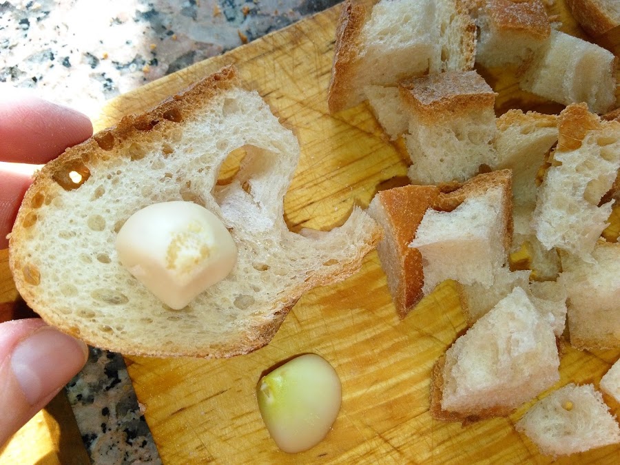 Mejor con pan del día anterior, cortamos en rebanadas, cortamos un ajo por la mitad y untamos (opcional) si no gusta el ajo se omite este paso.