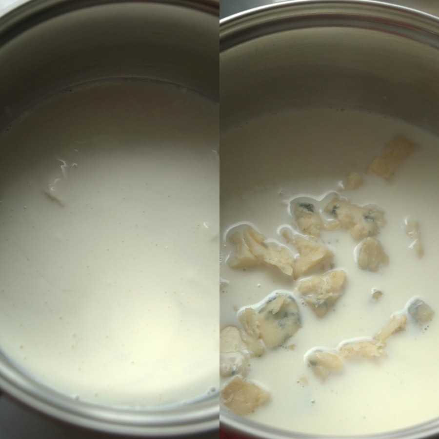 Bring to boil again, remove from the heat and add Cabrales blue cheese into dice.