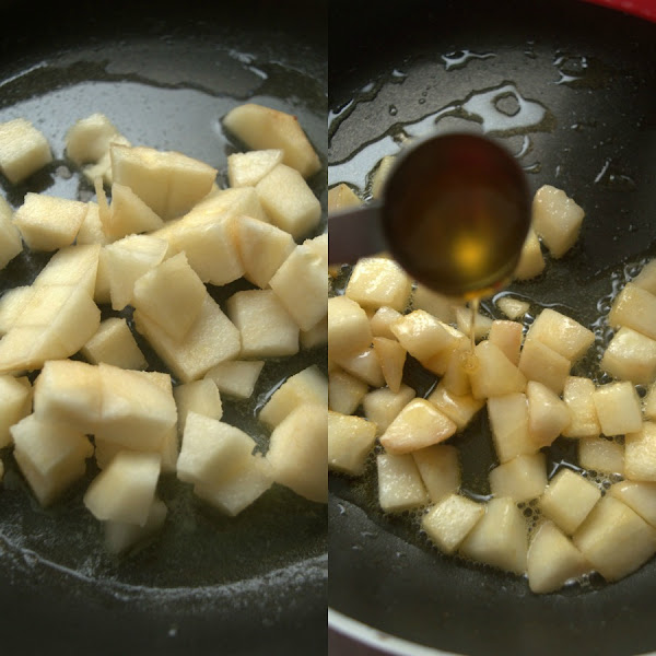 In a pan, melt butter and cook pears until golden. Stir slowly and continously. (10 minutes or so, medium heat).