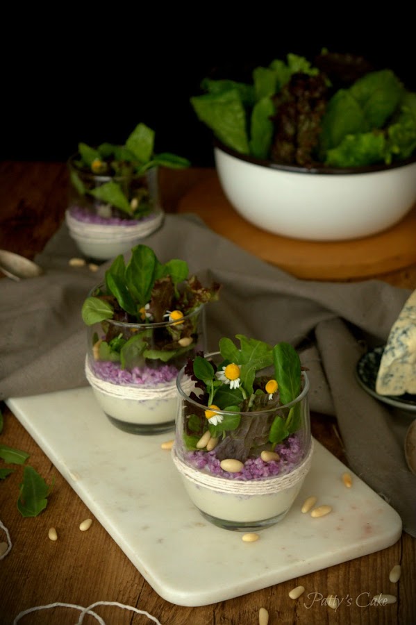 ¿No os da la impresión al ver esta receta que estáis contemplando un prado asturiano? El verde de los prados, las flores y, al fondo, el queso cabrales. Yo, después de hacerlo, me he dado cuenta de que podría ser perfectamente mi interpretación de esa preciosa región. Y a ti, ¿qué te parece?