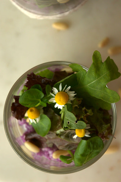 Fill the glasses with lettuce shoots and garnish with some flowers.