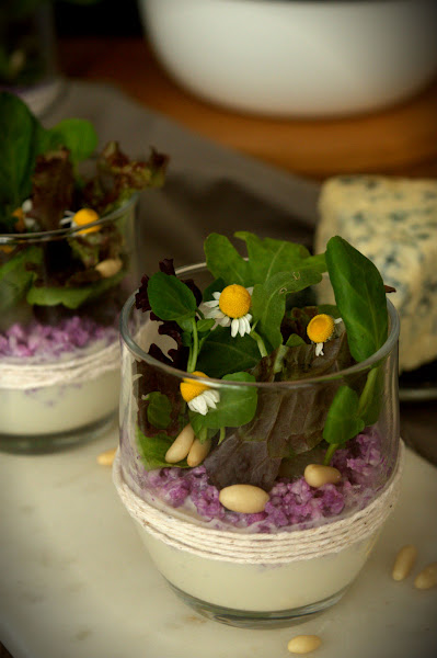 CREMA DE CABRALES CON PERAS CARAMELIZADAS, CUSCÚS DE COLIFLOR MORADA Y BROTES DE LECHUGAS