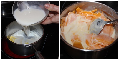 En un cazo ponemos la mantequilla y la derretimos, añadimos la harina de maíz diluida en la leche, añadimos el queso cheddar y los quesitos.