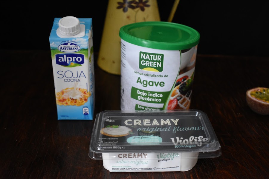 Aprovechando que me han regalado unas frutas tropicales,entre ellas maracuyá,he preparado una crema de queso (sin queso),sin lácteos,sin azúcar....vamos,sin ná.