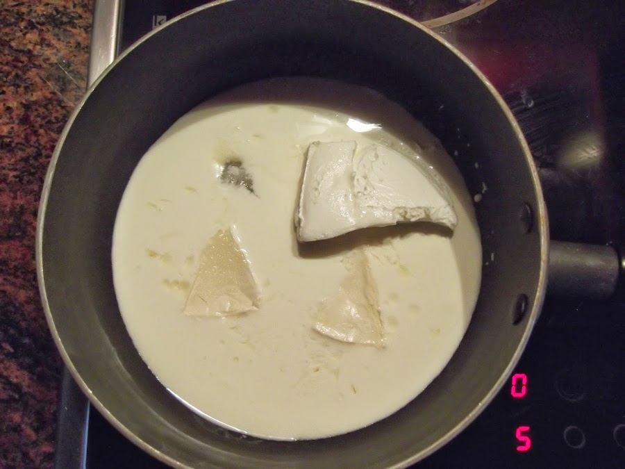 Lo primero que hacemos es poner a calentar la nata (crema de leche) y echamos los cuatro quesitos y el queso crema. Le damos un par de vueltas y añadimos el azúcar y la esencia de vainilla. Con una cuchara de madera no paramos de dar vueltas ya que se nos puede quemar el azúcar. Cuando empiece a hervir lo sacamos y lo pasamos por la batidora para que quede una crema más fina.