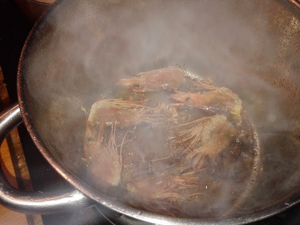 Ponemos en una olla el aceite y echamos las cabezas de los gambones, que sofreiremos y chafaremos un poco para sacarles el máximo suquillo.Sacamos las cabezas una vez sofritas en 2 minutos
