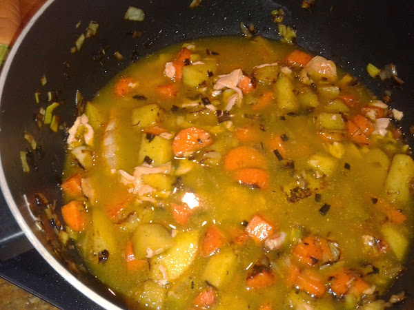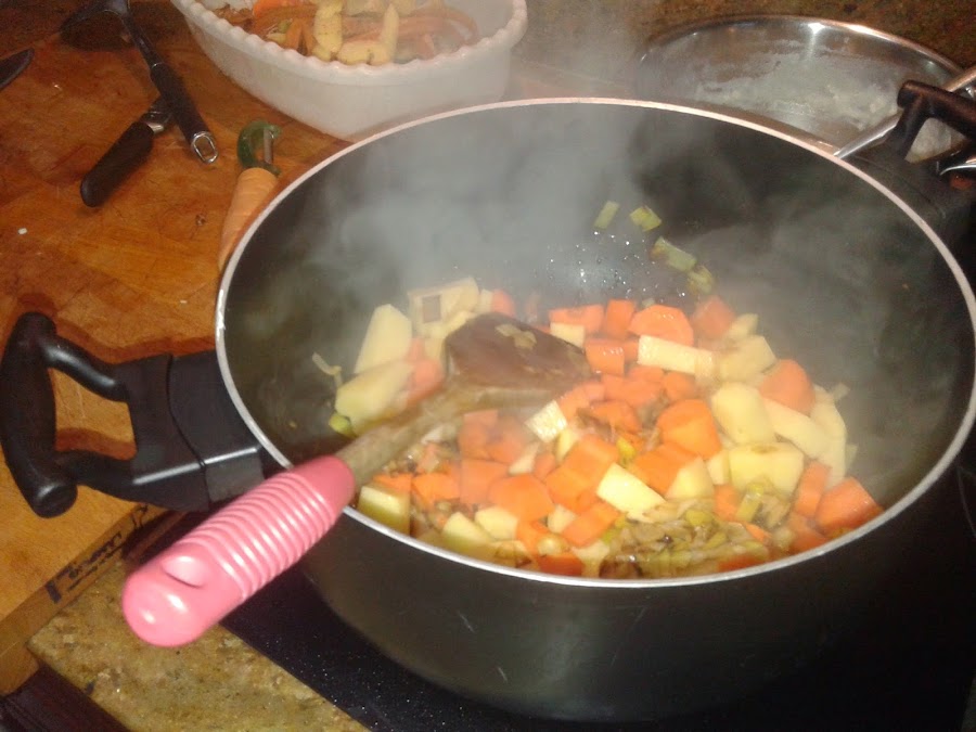 Echamos cortadas no muy grande, las zanahorias y las patatas y removeremos durante 10 minutos para que no se pegue.