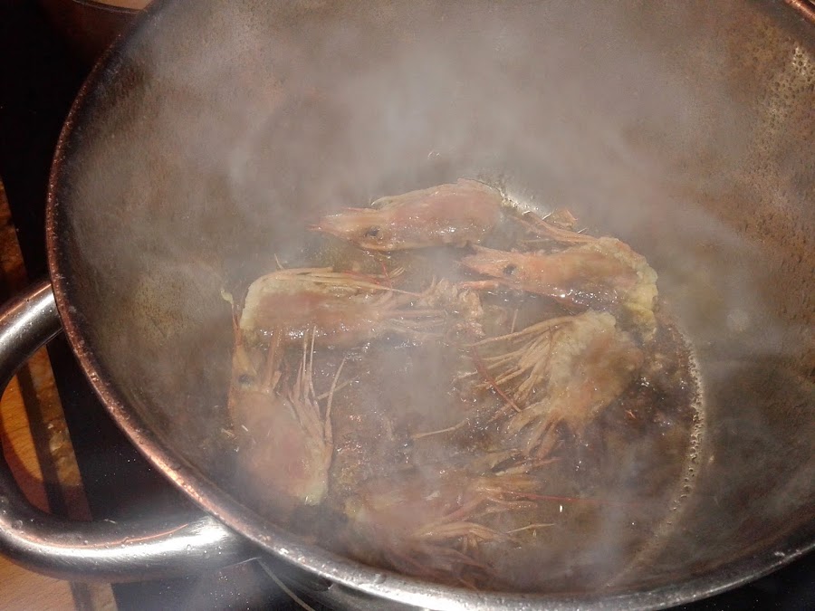 Una vez las colas de los gambones tomen color, echaremos el caldo de pescado y coceremos 15 minutos.