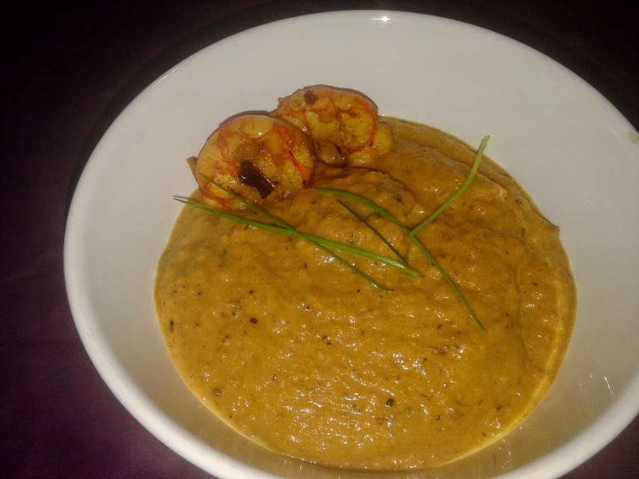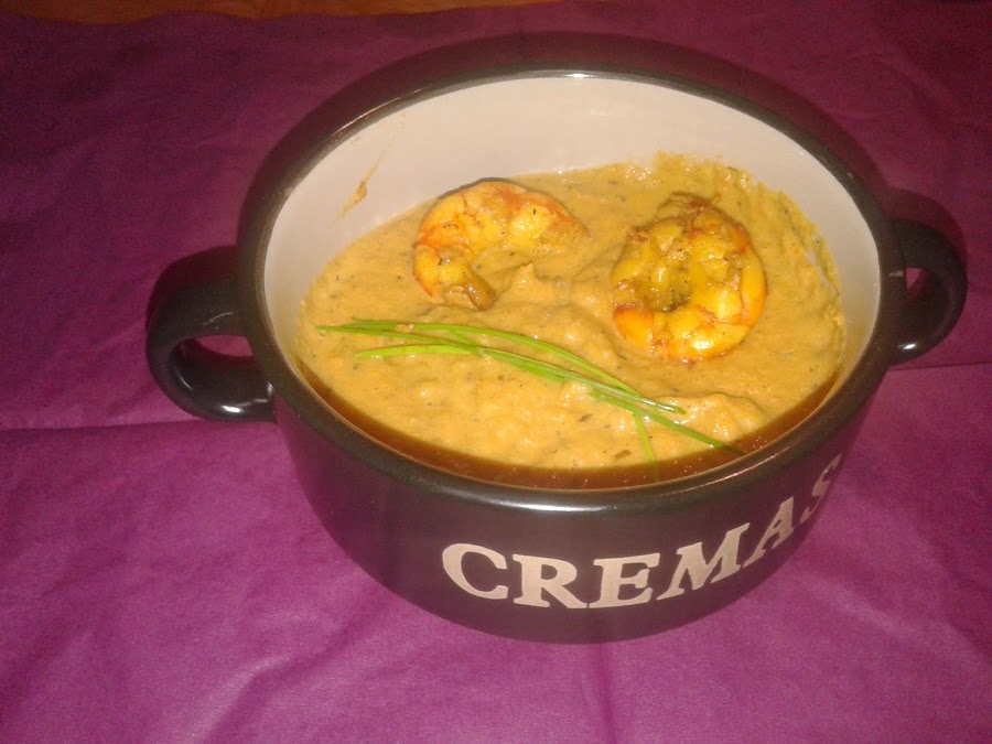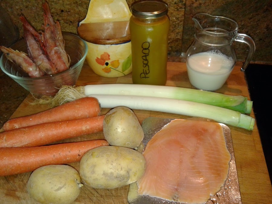 150 g de salmón ahumado, 2 puerros, 2 zanahorias, 2 patatas, 500 ml de caldo de pescado, 200 ml de leche, 8 gambones, 8 cucharadas de aceite de oliva y un poquito de sal.