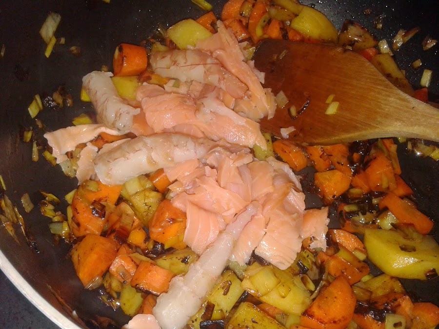 Es el momento de echar las colas de los gambones peladas y enteras y el salmón ahumado que también habremos troceado con el cuchillo en trocitos.