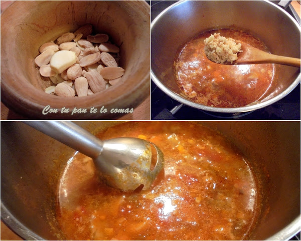 5. Machacamos en el mortero las almendras junto con el diente de ajo y se lo añadimos al caldo de las setas. Dejamos que se hagan cinco o diez minutos más y trituramos con la batidora hasta que quede una crema lo más fina posible. Prueba de sal y añade si es necesario.