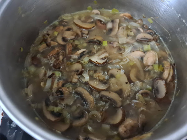 5. - Añadimos el agua hastya cubrir las setas, mas o menos unos 500- 750 ml. Tapamos y dejamos cocinar durante 20 minutos, contado desde que empiece a hervir.
