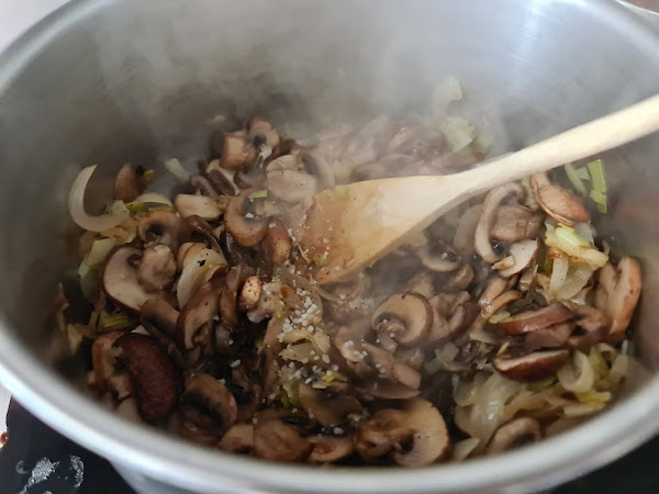 Y con respecto a las setas, yo he comprado dos bandejas una de champiñones laminados y otra de otro tipo de champiñón o seta que tiene un sabor más intenso, pero si no las encontráis podéis hacerla sólo con champiñones.
