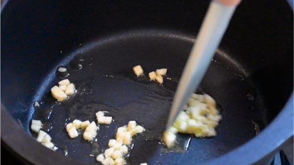 En una cacerola echamos unas cucharadas soperas de aceite de oliva. Lo ponemos a calentar a fuego medio alto y cuando esté listo le echamos los dientes de ajos pelados y cortados en trozos pequeños. Sofreímos durante un par de minutos.A continuación, agregamos el tomate triturado. También puedes usar tomate entero o en trozos. Luego lo batiremos para obtener la crema. Puedes usar tomate natural también, vale igualmente para esta receta.