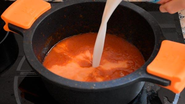 Después, echamos la leche de coco. Yo he usado leche de coco pero puedes usar otra bebida vegetal, nata (crema de leche), crema o leche evaporada que también le va muy bien.