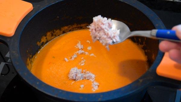 Finalmente, sólo tenemos que añadir el atún de lata desmigado y ya la tendríamos lista para consumir. El atún si no lo quieres mezclar con la crema lo puedes servir por encima justo en el momento que lo vayas a servir.