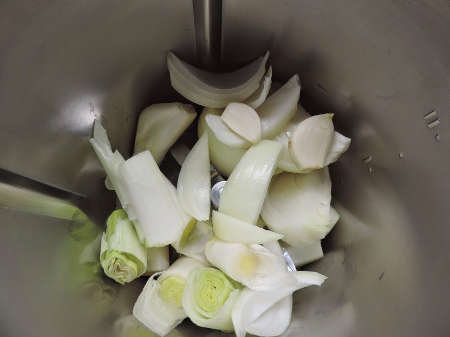 Poner en el vaso del thermomix, el puerro, cebolla y los ajos.