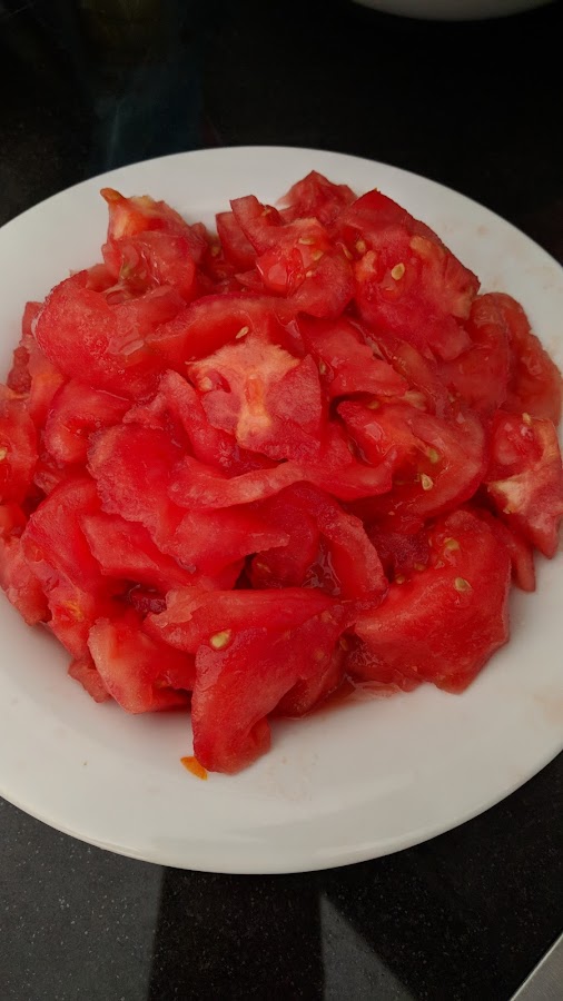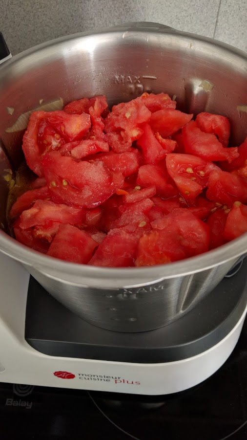 3.- Pelamos y partimos los tomates. Ponemos en la jarra, junto con la sal y el agua, y programamos 30 minutos, 95 grados y velocidad 1
