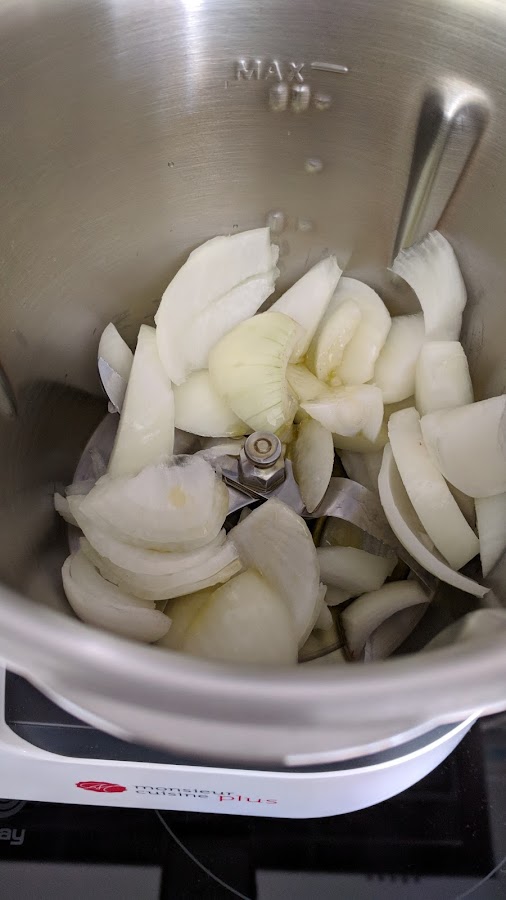 1.- Ponemos la cebolla con 2 cucharadas de aceite en el vaso y programamos rehogar subiendo hasta 14 minutos