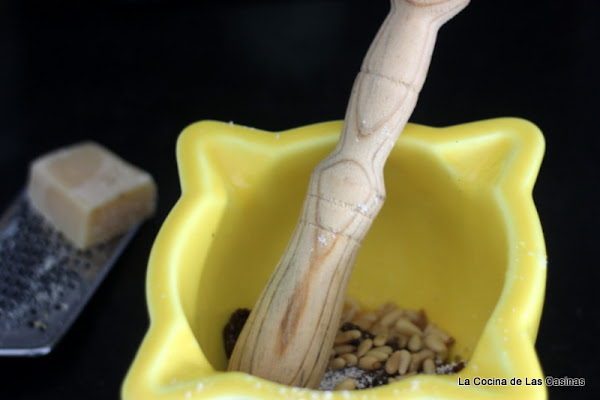 Mientras tanto, corta en tiras los tomates secos, tuesta los piñones y ralla el queso. Muele en el mortero junto con un cdta. de aceite de los propios tomate. Reserva-