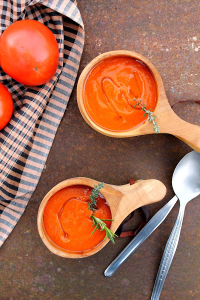 Hace años yo hacia una crema de tomate cocinada en una olla, pero después de probar con los tomates previamente asados ya me quedo con esta versión. La otra al lado de esta se queda como una versión insulsa. Y todo se debe al horneado.