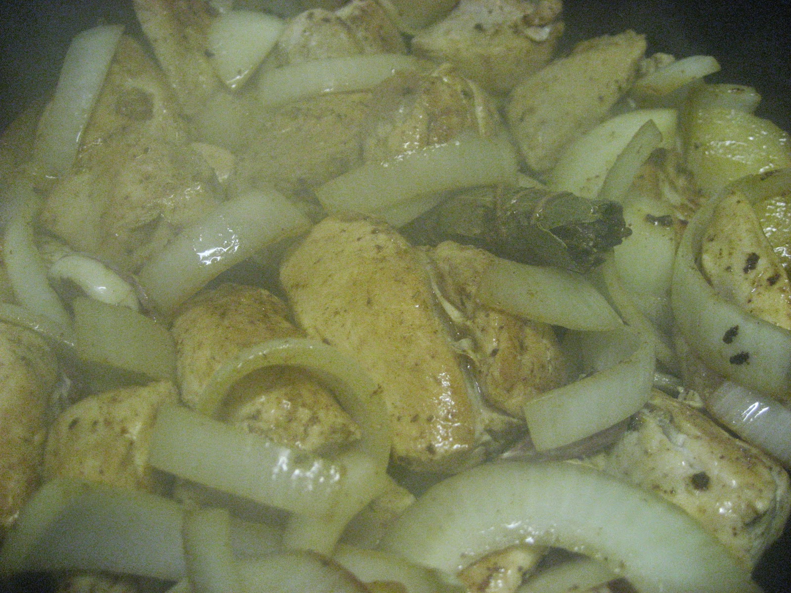 1º " Cortamos el pollo a trozos y lo colocamos en una cazuela, junto a una de las cebollas cortada a trozos, (no es necesario que sean demasiado pequeños), dejamos que se vaya dorando el pollo y le añadimos un poco de brandi y un poco de vermut, dejamos que reduzca un poco y le añadimos agua hasta que quede cubierto.
