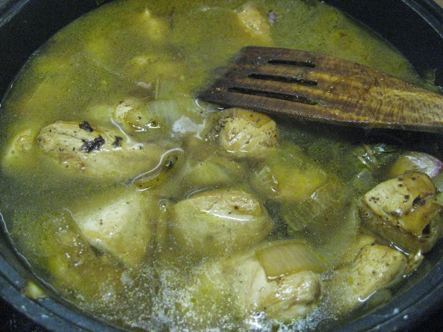 2º " Lo ponemos a fuego lento y dejamos que se vaya evaporando el agua que le hemos añadido. Cuando nos quede un dedo de caldo en el pollo lo retiraremos del fuego y lo reservaremos.