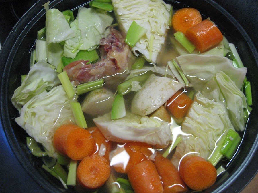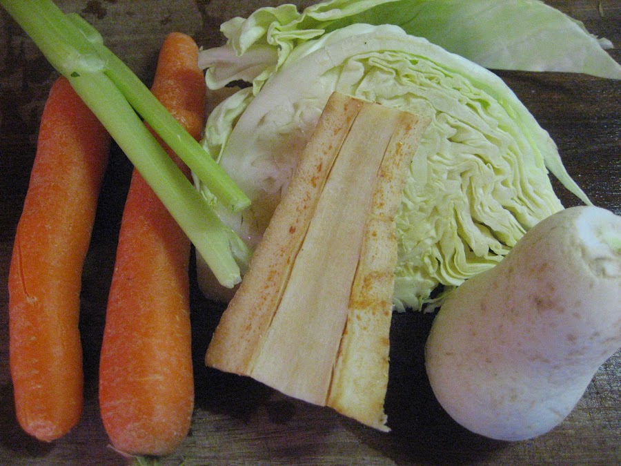 1º " Lo ponemos todo en una cazuela, puerros, remolacha, nabo, zanahorias y col. Es mejor que lo cortemos todo a trozos, no necesariamente demasiado pequeños, pero es mejor para la cocción.