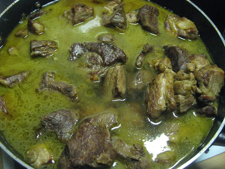 4º " Le echaremos el brandi que nos queda y el vermut, dejaremos que se evapore a fuego lento, le echamos el agua hasta que se cubra más o menos, tal y como se ve en la foto. Cuando le quede un dedo lo retiramos y reservamos.
