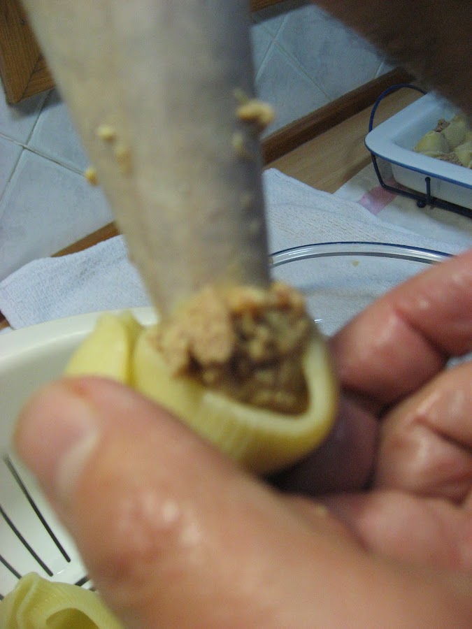 7º " Rellenamos la manga y en la misma operación los galets que ya habremos cocido según las instrucciones del fabricante, más que nada es por el tiempo de cocción, aunque si tenéis que tener en cuanta de dejarlos un minuto menos de lo que dice el paquete, ya que de esta manera no se romperán al rellenarlos. Los rellenamos y listos, solo nos queda montar el plato y sentarnos a degustarlo.