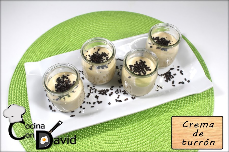 Ya tenemos nuestra crema de turron lista para comer, yo la he decorado con unas chispitas de chocolate, se le puede añadir almendra o trocitos de turrón desmigados.