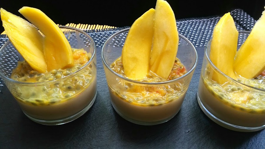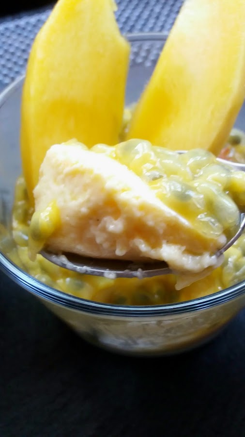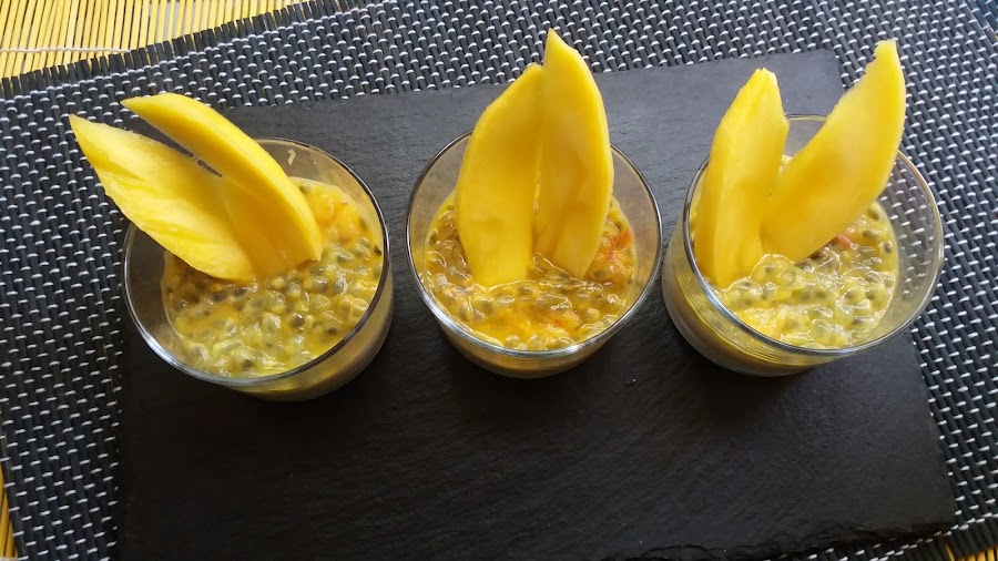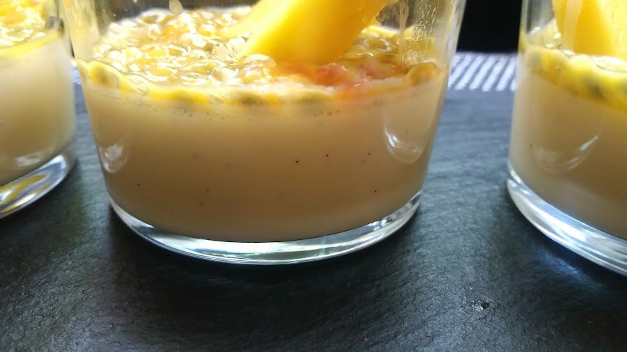 Lo primero que vamos a hacer es poner la gelatina a hidratar en agua fría. Mientras, ponemos a calentar la nata (crema de leche) con la vaina de vainilla abierta a lo largo. Separamos las yemas de las claras (las claras las guardamos para hacer otro postre) y batimos con las varillas las yemas y las dos cucharadas de Tagatosa. Echamos la nata (crema de leche) hirviendo sobre las yemas y la tagatosa y batimos rápidamente ( yo la he puesto otra vez a fuego lento unos minutos), ponemos las hojas de gelatina en la mezcla y removemos hasta que se disuelva y volcamos en los vasos. Metemos en el frigorífico mínimo una hora y antes de servir ponemos encima la carne de la fruta de la pasión y el mango al gusto. Es una mezcla de sabores muuuuy rica!! ¿Queréis probarlo??
