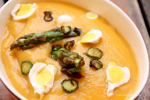 Trituramos y servimos, podemos decorar el plato con uno espárragos salteados y huevo duro troceado.Notas:
