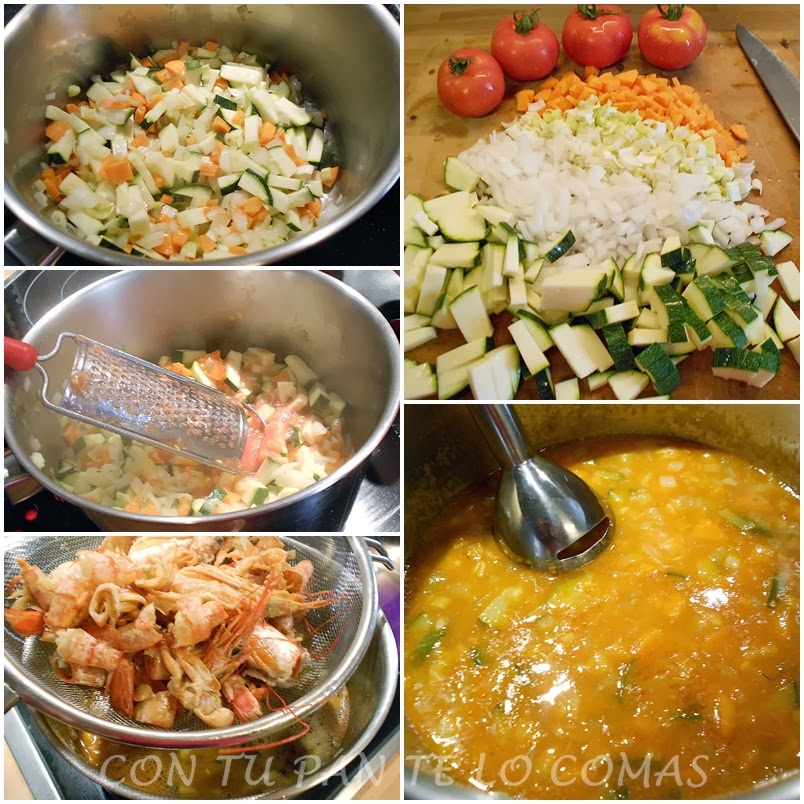 Cortamos todas las verduras menos los tomates y las ponemos en otra cazuela con aceite de oliva, les ponemos sal y las rehogamos unos minutos. Rallamos los tomates y colamos encima el caldo de las gambas que hemos hecho antes. Aprovecha ahora para aplastar bien las cabezas y que saquen todo el jugo que les quede.