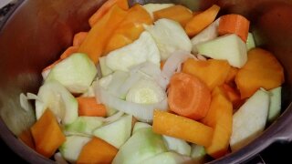 Cortamos y pelamos todos los ingredientes y los salteamos durante unos cinco minutos en el aceite, excepto la lechuga que la incorporaremos al final de la cocción de las verduras. Una vez salteados, cubrimos con un poco de agua, justo que las cubra, echamos un poco de sal y dejamos unos quince minutos o hasta que veamos que están tiernas.