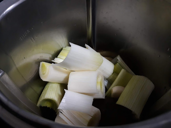 1.- Ponemos en el vaso las patatas, el tomate, el puerro, el ajo, el pimiento, la zanahoria, la sal, la pimienta y el agua y programamos 25 minutos, 100°, velocidad 1.